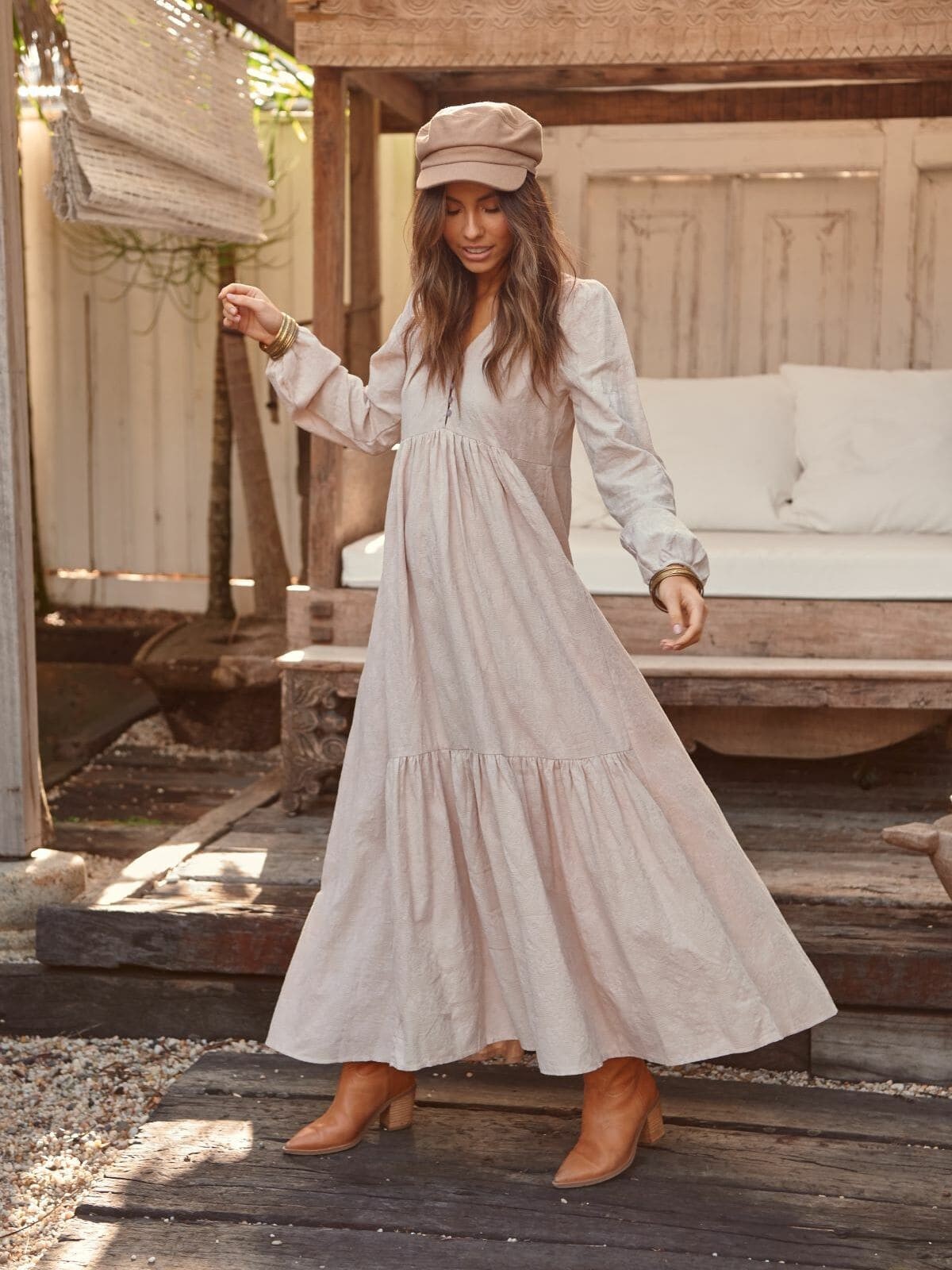 ALYSHA version longue est une robe JAASE de style romantique bohème en coton taupe clair.