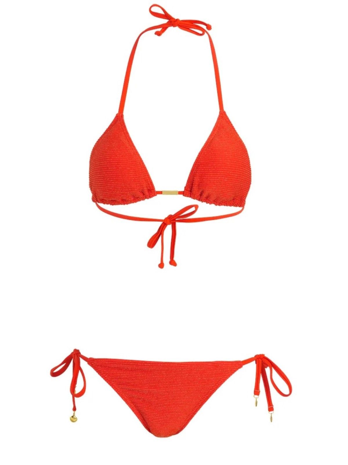 Chic et sexy le maillot de bain 2 pièces Léa Lurex or est un bikini triangle du plus bel effet, légèrement scintillant au soleil avec entre les seins un bijou or enfilé sur le cordon d'attache ainsi que des pampilles au bout des cordons latéraux d'attache du bas de maillot. Pour dorer au soleil vous serez fabuleuse dans le coloris proposé ici Vermillon un bel orangé foncé ;-)