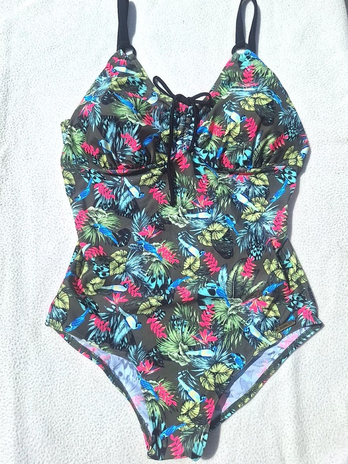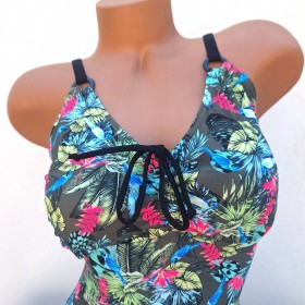 Il fait partie des classiques basiques de la marque LAGON BLEU le Maillot de Bain 1 pièce VIRGINIA ici en plein dans la tendance Jungle dans cet imprimé Perroquets Bleus sur un fond Kaki avec des pointes de roses vif. Il emboîte bien les fesses et ses bretelles sont réglables en plus d'un cordon coulissant entre les seins pour un réglage plus ou moins profond du décolleté ... Les pulpeuses foncez !!!